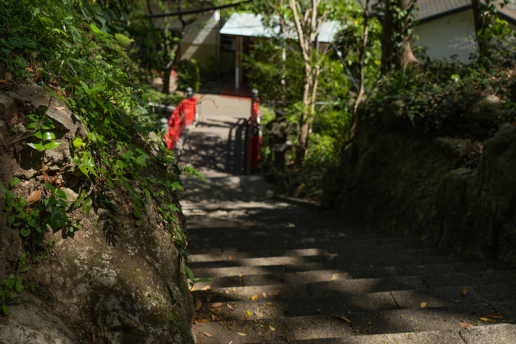 Back alley of Enoshima, stairs leading to a vermilion bridge